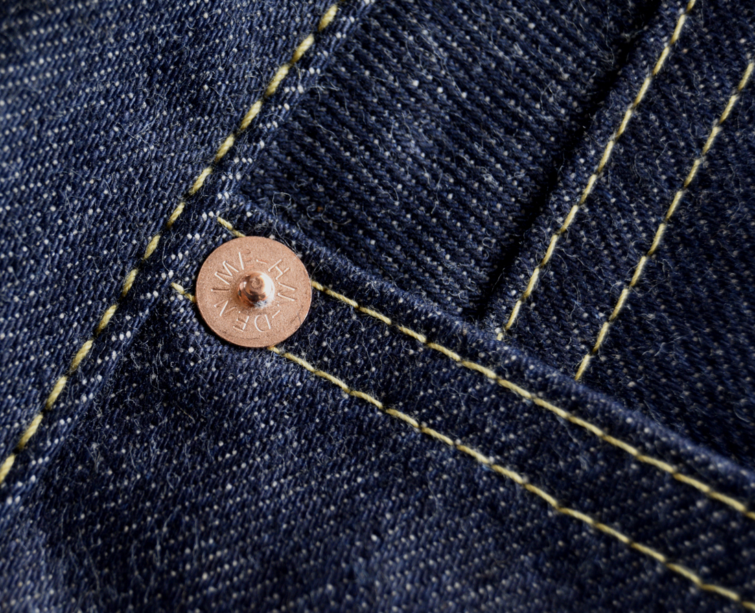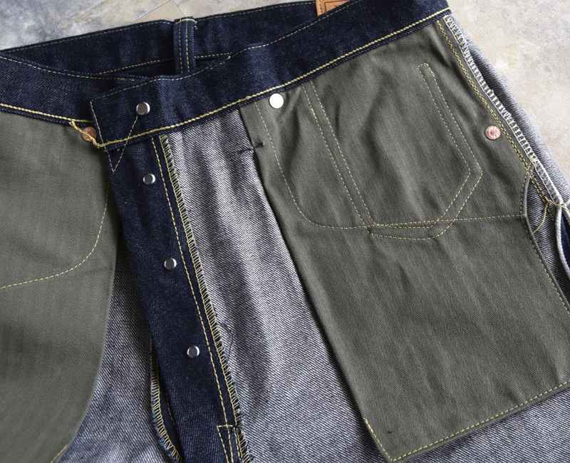 少し肉厚のデニム素材で仕上げており、ポケットスレキはオリジナルODグリーンのへリンボンスレキを使用。
