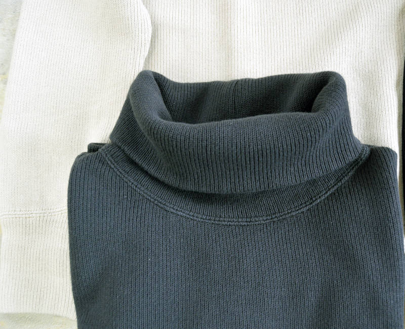 特殊な編み機で編んだ素材で表面はセーターのような表情、裏面は天竺編みになっ