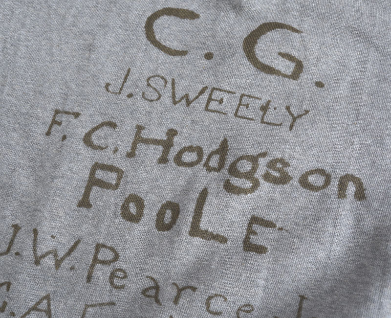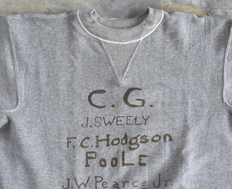カットソーがウールからコットンに変わった1930年代からある挟み込み仕様の腰リブ。首まわりには伸縮に富むV字のフライスを前後に配した四本針仕様。肩口から垂直に落ちる袖口のセットインスリーブはややソリッドな印象を受けるシンプルなデザインですが、腰帯のバインダー仕様は着込むほどにアタリが生まれます。