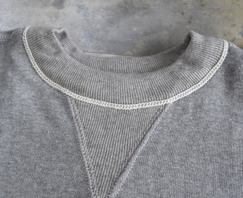 20年以上仕様を変更していない定番の吊り編みスウェットです。二本ステッチの間から粗めのロック糸が見える仕様はヴィンテージでしか見られないディテールですが、ミシンを改良することで実現させました。かつてコットンフリースラインドと呼ばれた裏起毛も、筒状のまま起毛をかけて再現しています。