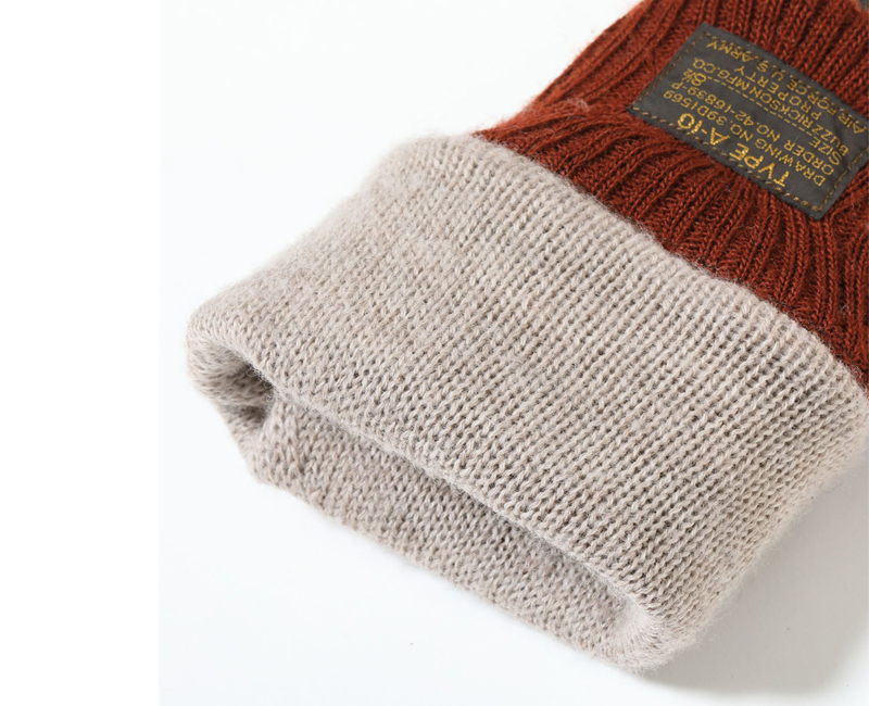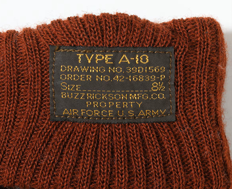 米陸軍航空隊のタイプA-10グローブはパイロットの冬季用グローブとして1938年から採用された。メインマテリアルとなる革はゴートスキンかポニーハイドを使用するよう規定され、ライニングには肌触りの良いウール100%のニットが使用されている。手首にはストレスの掛からないチューブ編みのウールニットが装着され、このニットには着用時に伸びを防ぐ補強用の当て革が縫い付けられている。手の甲に施された3本のステッチは革の伸びを抑え、フィット感を維持するためのディテール。5本の指周りを往復する手の平側と甲側の縫製は高度な縫製技術が要求され、繊細なステッチが時間を掛けて丁寧に縫い上げられたことを物語る。