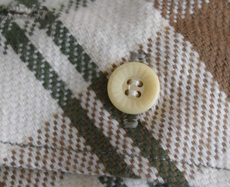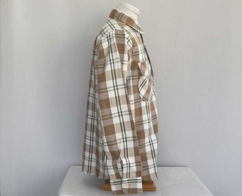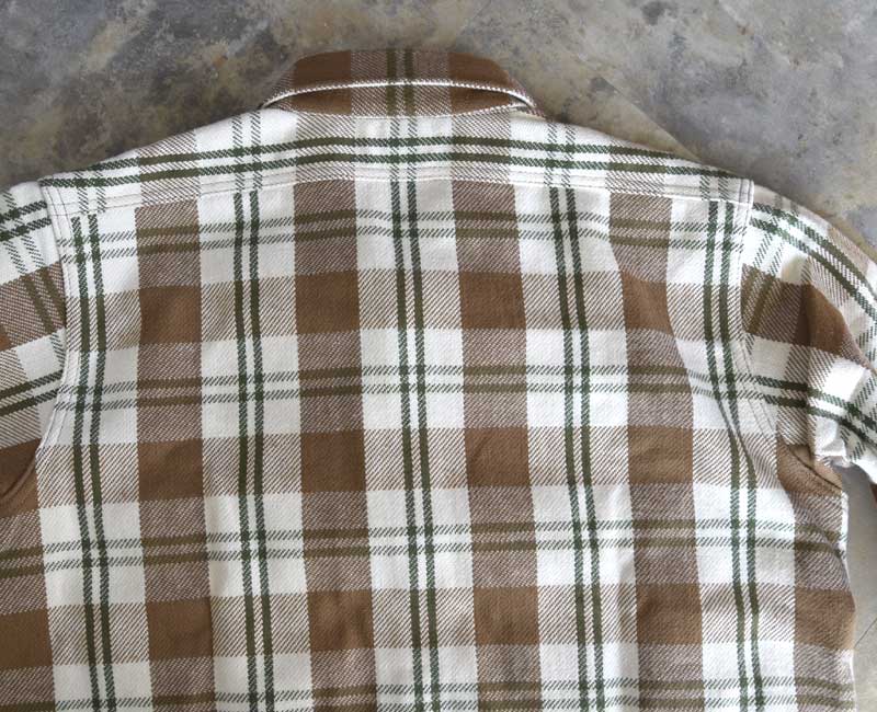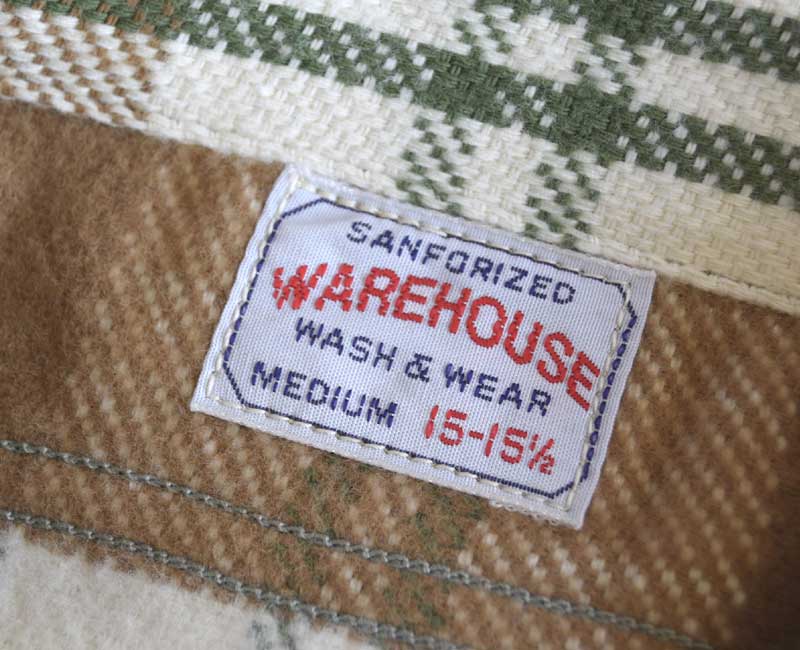 ウエアハウスのネルシャツは、生地に日本では限られた地域にしか残っていない力織機を使用して生地を作っています。フランネルの生地を作るために力織機を使う理由は単なる「耳付きのネル生地」を作りたいという理由からではありません、あくまでもセルビッチは副産物なのです。その目的は、力織機を使用することでムラ糸の持つ風合いを損なうことなく、生地に仕上げることができるからです。デニムと同じで、ヴィンテージネルシャツの生地を織っていた糸は不均一なムラ糸であった時代です。その糸を革新織機で強いテンションをかけて織ると違う生地になってしまう。せっかくの糸本来の性質が損なわれてしまうのです。旧式の力織機で織る事で、糸本来が持つ凹凸を損なうことなく生地を織ることが出来ます。ネルシャツを織る力織機はデニムと同じ綾織りの織機です。ネルシャツは柄を構成する必要があるため、多色の糸を織れる仕組みになっています。タテ糸は柄に合わせて複雑に上下移動し、その間を違う色のヨコ糸を持ったシャトルが次々に入れ替わり往復に移動します。こうして力織機らしい適度なテンションで織られたフランネルは、それぞれの糸本来が持っているムラを損なうことなく生地となるのです。生地になったネル生地は、当時の製法に倣って生地の裏に起毛加工を施しています。起毛をかけることで柄に柔らかい表情が生まれます。さらに起毛をかけることで生地に膨らみを生み、力織機ならではの肌触りをさらに柔らかなものに昇華させることができます。このように、力織機で織られたネルは、糸そのものから再現することでこそ生まれる風合いを持っています。それを見分ける最も簡潔な方法がセルビッチ(耳)の有無であり、1960年代頃までのヴィンテージネルシャツと同じように、ウエアハウスでもマチ部分にセルビッチを使用しているのです。