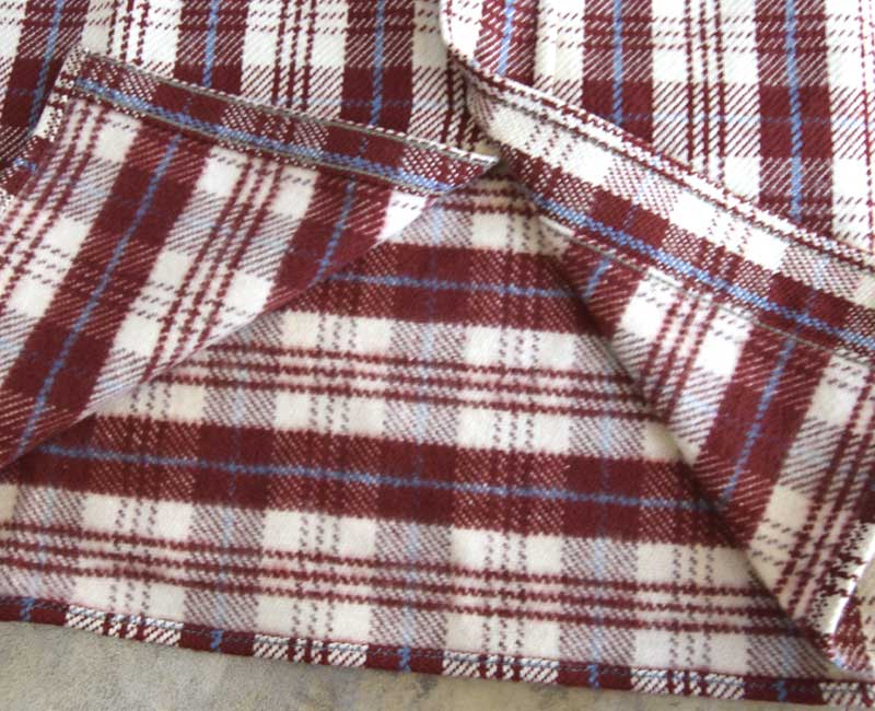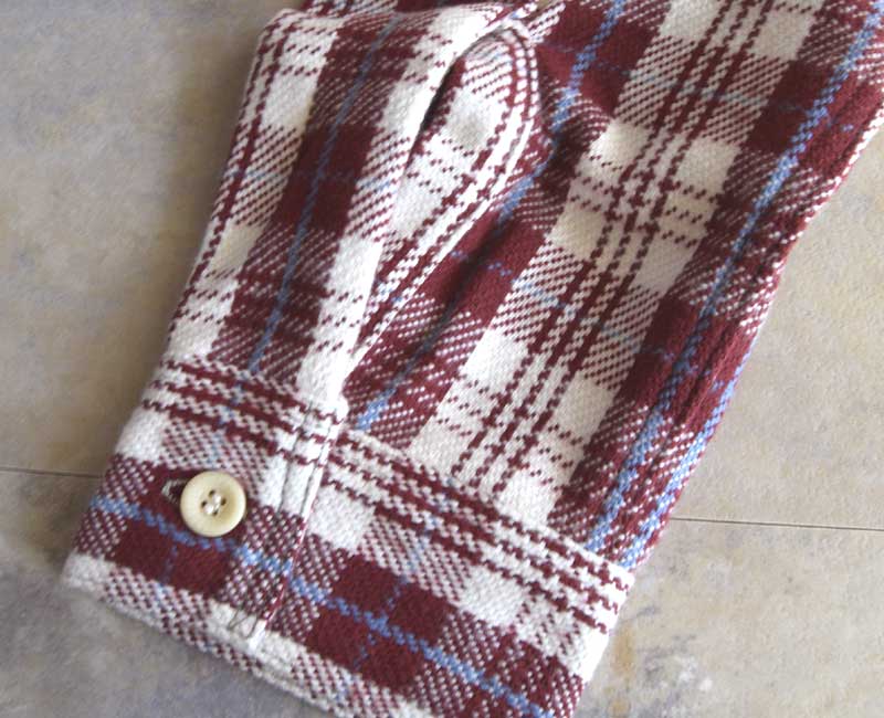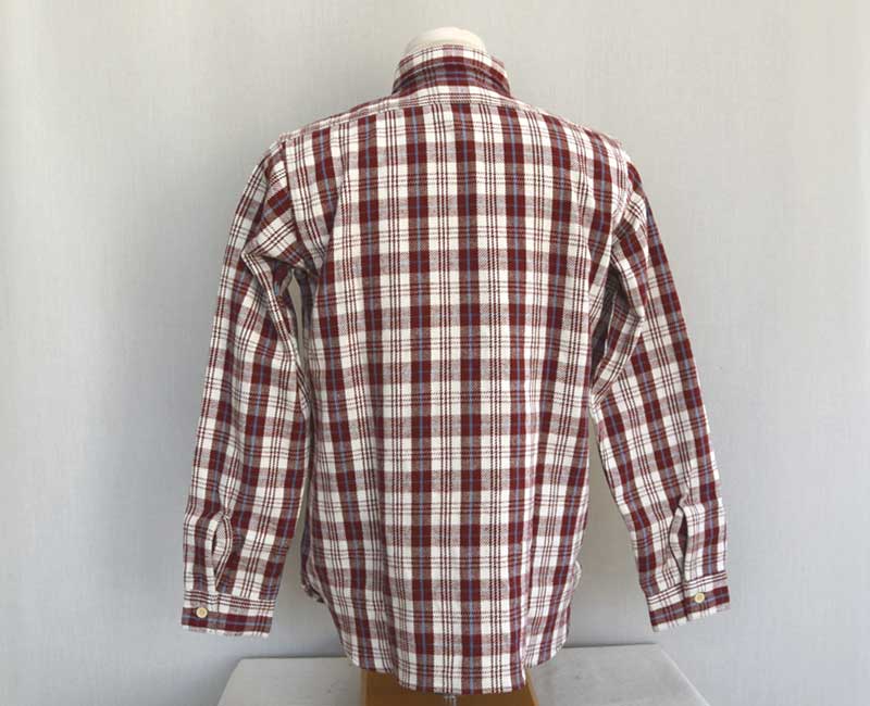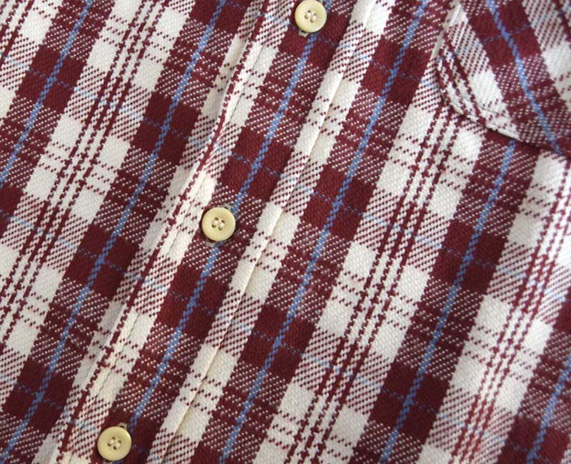 ウエアハウスのネルシャツは、生地に日本では限られた地域にしか残っていない力織機を使用して生地を作っています。フランネルの生地を作るために力織機を使う理由は単なる「耳付きのネル生地」を作りたいという理由からではありません、あくまでもセルビッチは副産物なのです。その目的は、力織機を使用することでムラ糸の持つ風合いを損なうことなく、生地に仕上げることができるからです。デニムと同じで、ヴィンテージネルシャツの生地を織っていた糸は不均一なムラ糸であった時代です。その糸を革新織機で強いテンションをかけて織ると違う生地になってしまう。せっかくの糸本来の性質が損なわれてしまうのです。旧式の力織機で織る事で、糸本来が持つ凹凸を損なうことなく生地を織ることが出来ます。ネルシャツを織る力織機はデニムと同じ綾織りの織機です。ネルシャツは柄を構成する必要があるため、多色の糸を織れる仕組みになっています。タテ糸は柄に合わせて複雑に上下移動し、その間を違う色のヨコ糸を持ったシャトルが次々に入れ替わり往復に移動します。こうして力織機らしい適度なテンションで織られたフランネルは、それぞれの糸本来が持っているムラを損なうことなく生地となるのです。生地になったネル生地は、当時の製法に倣って生地の裏に起毛加工を施しています。起毛をかけることで柄に柔らかい表情が生まれます。さらに起毛をかけることで生地に膨らみを生み、力織機ならではの肌触りをさらに柔らかなものに昇華させることができます。このように、力織機で織られたネルは、糸そのものから再現することでこそ生まれる風合いを持っています。それを見分ける最も簡潔な方法がセルビッチ(耳)の有無であり、1960年代頃までのヴィンテージネルシャツと同じように、ウエアハウスでもマチ部分にセルビッチを使用しているのです。
