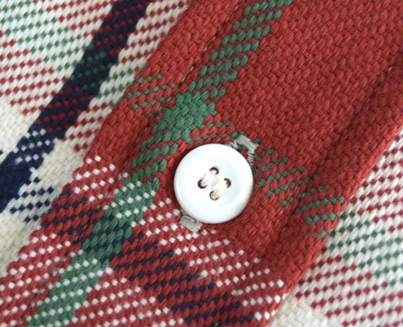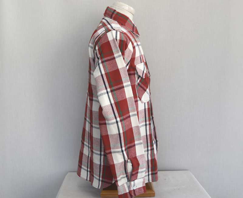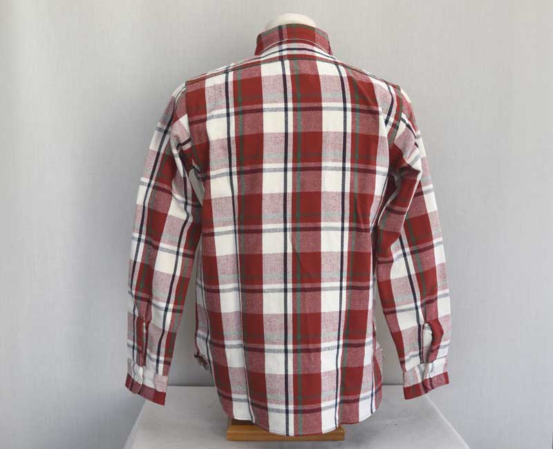 ウエアハウスのネルシャツは、生地に日本では限られた地域にしか残っていない力織機を使用して生地を作っています。フランネルの生地を作るために力織機を使う理由は単なる「耳付きのネル生地」を作りたいという理由からではありません、あくまでもセルビッチは副産物なのです。その目的は、力織機を使用することでムラ糸の持つ風合いを損なうことなく、生地に仕上げることができるからです。デニムと同じで、ヴィンテージネルシャツの生地を織っていた糸は不均一なムラ糸であった時代です。その糸を革新織機で強いテンションをかけて織ると違う生地になってしまう。せっかくの糸本来の性質が損なわれてしまうのです。旧式の力織機で織る事で、糸本来が持つ凹凸を損なうことなく生地を織ることが出来ます。ネルシャツを織る力織機はデニムと同じ綾織りの織機です。ネルシャツは柄を構成する必要があるため、多色の糸を織れる仕組みになっています。タテ糸は柄に合わせて複雑に上下移動し、その間を違う色のヨコ糸を持ったシャトルが次々に入れ替わり往復に移動します。こうして力織機らしい適度なテンションで織られたフランネルは、それぞれの糸本来が持っているムラを損なうことなく生地となるのです。生地になったネル生地は、当時の製法に倣って生地の裏に起毛加工を施しています。起毛をかけることで柄に柔らかい表情が生まれます。さらに起毛をかけることで生地に膨らみを生み、力織機ならではの肌触りをさらに柔らかなものに昇華させることができます。このように、力織機で織られたネルは、糸そのものから再現することでこそ生まれる風合いを持っています。それを見分ける最も簡潔な方法がセルビッチ(耳)の有無であり、1960年代頃までのヴィンテージネルシャツと同じように、ウエアハウスでもマチ部分にセルビッチを使用しているのです。