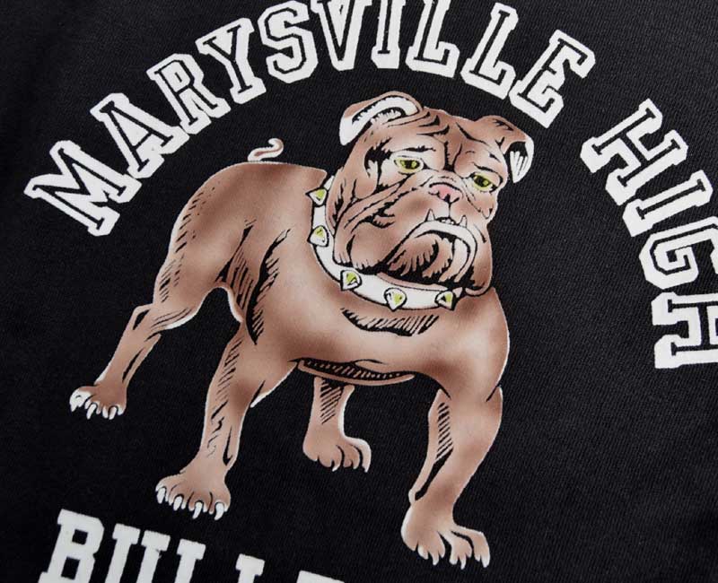 このボディに、カンザス州メアリーズビルのアメフトチームのキャラクターであるブルドッグが繊細な多色使いのフロッキープリントで描かれています。