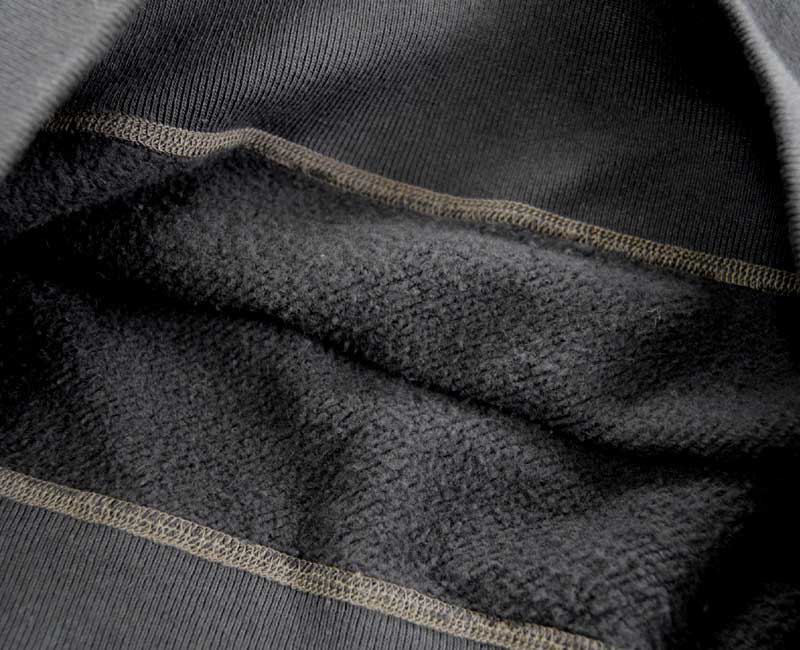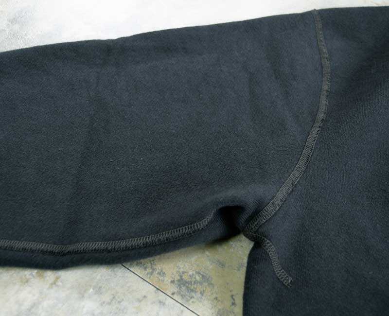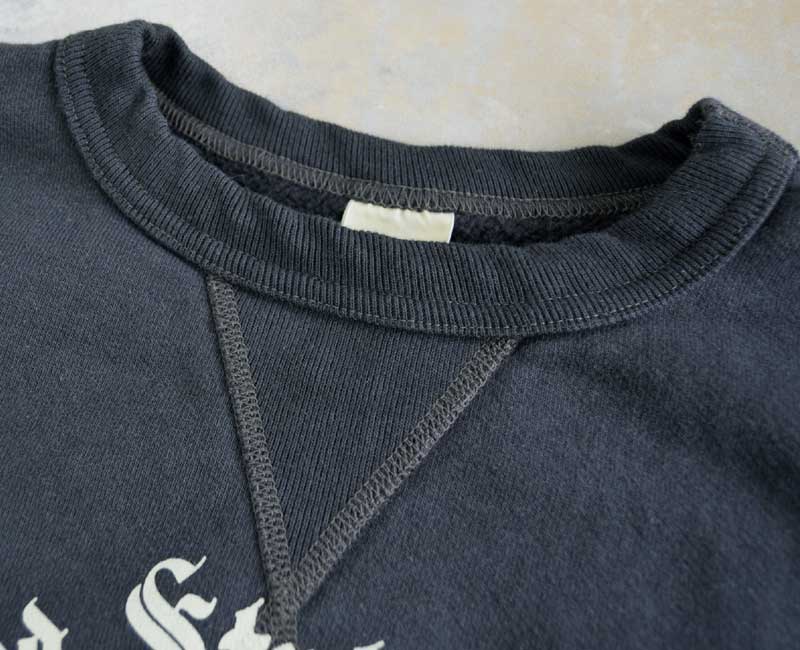 ウールニットの素材からループ状の裏起毛を持つコットン素材に生まれ変わり、“汗を吸うシャツ”として米国民のデイリーウェアとして進化を遂げたスウェットシャツ。ハードなトレーニングを日常とする軍や士官学校もいち早く目を付け、全米に点在する基地売店でも扱われるようになった。素材は当時と同じように不均一なテンションで編み込まれる筒状の吊り編み機を使用しているため、特有の柔軟性を持つ素材である。縫合は肌着などに適した4本針のフラットシーマによるもので、V字型のガゼットは身頃の上にリブ素材を乗せて縫い付けた、通称“叩き付けV”の仕様。