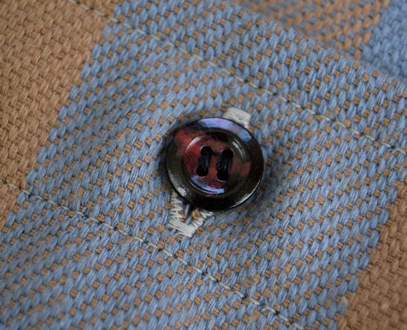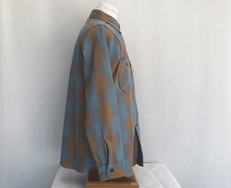 ウエアハウスのネルシャツは、生地に日本では限られた地域にしか残っていない力織機を使用して生地を作っています。フランネルの生地を作るために力織機を使う理由は単なる「耳付きのネル生地」を作りたいという理由からではありません、あくまでもセルビッチは副産物なのです。その目的は、力織機を使用することでムラ糸の持つ風合いを損なうことなく、生地に仕上げることができるからです。デニムと同じで、ヴィンテージネルシャツの生地を織っていた糸は不均一なムラ糸であった時代です。その糸を革新織機で強いテンションをかけて織ると違う生地になってしまう。せっかくの糸本来の性質が損なわれてしまうのです。旧式の力織機で織る事で、糸本来が持つ凹凸を損なうことなく生地を織ることが出来ます。ネルシャツを織る力織機はデニムと同じ綾織りの織機です。ネルシャツは柄を構成する必要があるため、多色の糸を織れる仕組みになっています。タテ糸は柄に合わせて複雑に上下移動し、その間を違う色のヨコ糸を持ったシャトルが次々に入れ替わり往復に移動します。こうして力織機らしい適度なテンションで織られたフランネルは、それぞれの糸本来が持っているムラを損なうことなく生地となるのです。生地になったネル生地は、当時の製法に倣って生地の裏に起毛加工を施しています。起毛をかけることで柄に柔らかい表情が生まれます。さらに起毛をかけることで生地に膨らみを生み、力織機ならではの肌触りをさらに柔らかなものに昇華させることができます。このように、力織機で織られたネルは、糸そのものから再現することでこそ生まれる風合いを持っています。それを見分ける最も簡潔な方法がセルビッチ(耳)の有無であり、1960年代頃までのヴィンテージネルシャツと同じように、ウエアハウスでもマチ部分にセルビッチを使用しているのです。
