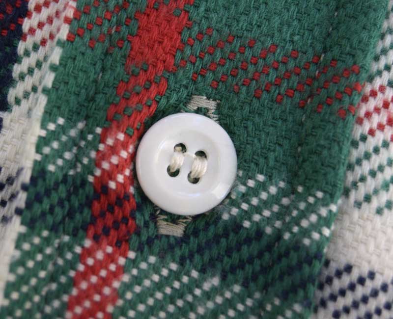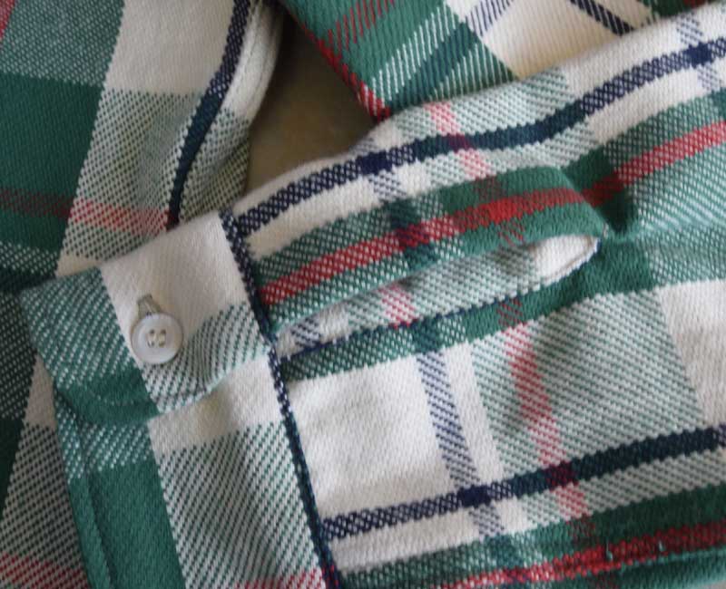 ウエアハウスのネルシャツは、生地に日本では限られた地域にしか残っていない力織機を使用して生地を作っています。フランネルの生地を作るために力織機を使う理由は単なる「耳付きのネル生地」を作りたいという理由からではありません、あくまでもセルビッチは副産物なのです。その目的は、力織機を使用することでムラ糸の持つ風合いを損なうことなく、生地に仕上げることができるからです。デニムと同じで、ヴィンテージネルシャツの生地を織っていた糸は不均一なムラ糸であった時代です。その糸を革新織機で強いテンションをかけて織ると違う生地になってしまう。せっかくの糸本来の性質が損なわれてしまうのです。旧式の力織機で織る事で、糸本来が持つ凹凸を損なうことなく生地を織ることが出来ます。ネルシャツを織る力織機はデニムと同じ綾織りの織機です。ネルシャツは柄を構成する必要があるため、多色の糸を織れる仕組みになっています。タテ糸は柄に合わせて複雑に上下移動し、その間を違う色のヨコ糸を持ったシャトルが次々に入れ替わり往復に移動します。こうして力織機らしい適度なテンションで織られたフランネルは、それぞれの糸本来が持っているムラを損なうことなく生地となるのです。生地になったネル生地は、当時の製法に倣って生地の裏に起毛加工を施しています。起毛をかけることで柄に柔らかい表情が生まれます。さらに起毛をかけることで生地に膨らみを生み、力織機ならではの肌触りをさらに柔らかなものに昇華させることができます。このように、力織機で織られたネルは、糸そのものから再現することでこそ生まれる風合いを持っています。それを見分ける最も簡潔な方法がセルビッチ(耳)の有無であり、1960年代頃までのヴィンテージネルシャツと同じように、ウエアハウスでもマチ部分にセルビッチを使用しているのです。