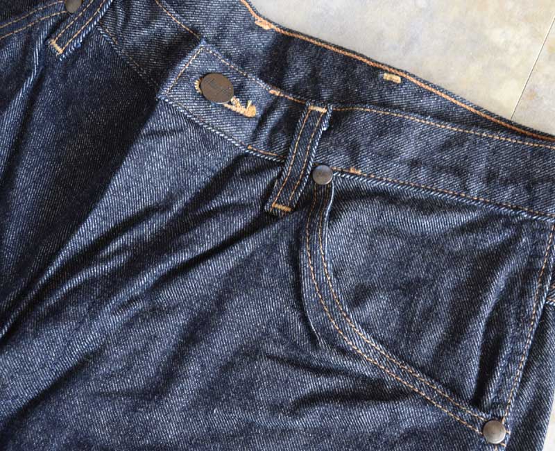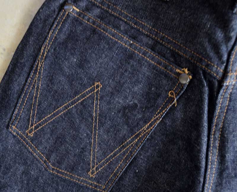 ヒップポケットに施されたWステッチの形状が内側へ巻き込むようなデザインとなっており、