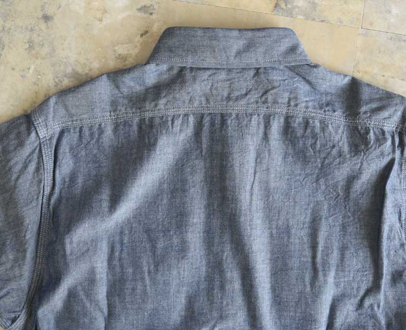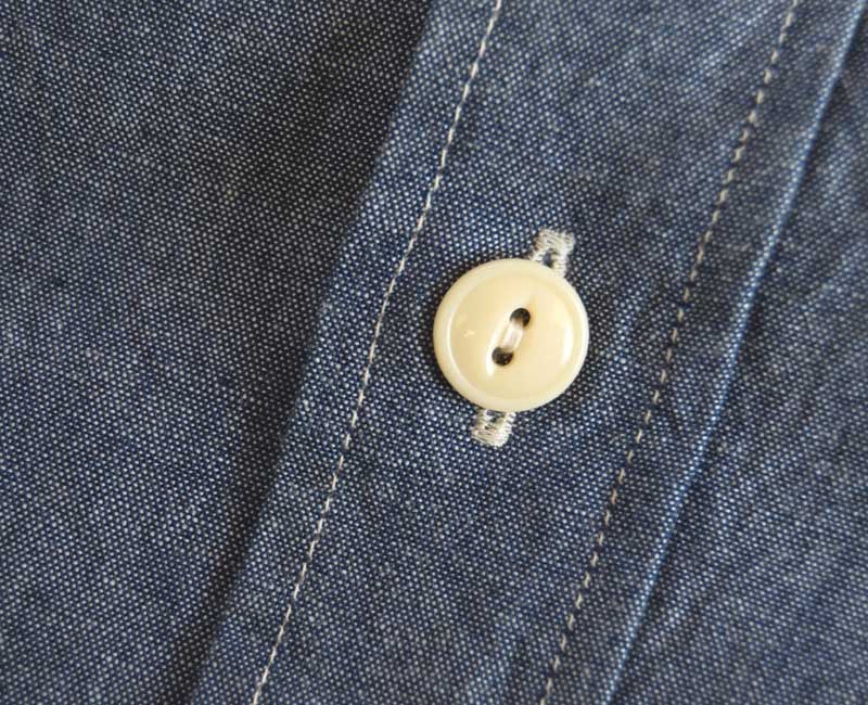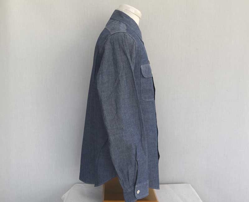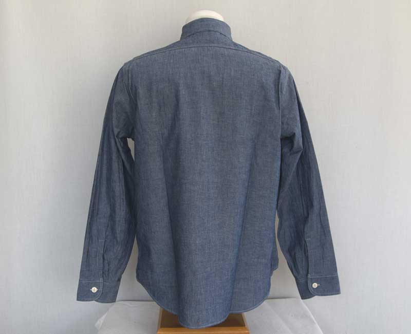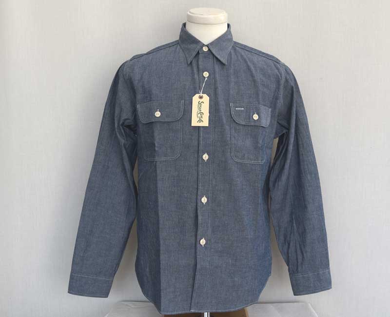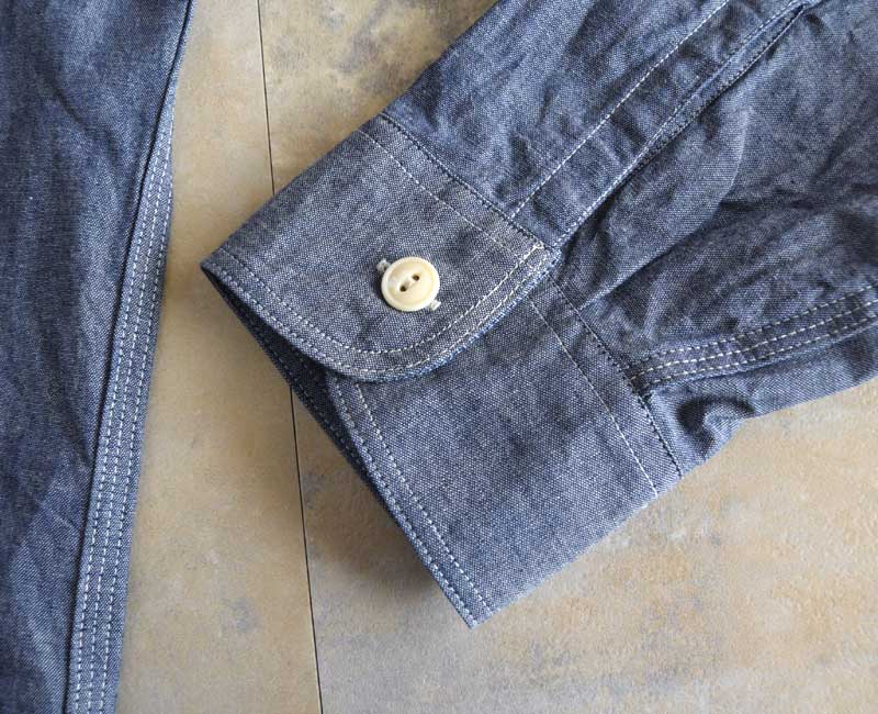 1950年代のシャンブレーシャツがベース。ワークウエアらしい3本針巻き縫い仕様のタフな作り。経糸にインディゴ糸、緯糸を白糸で織り上げたブルーシャンブレー生地を使用している。同型でショートスリーブモデルも展開。