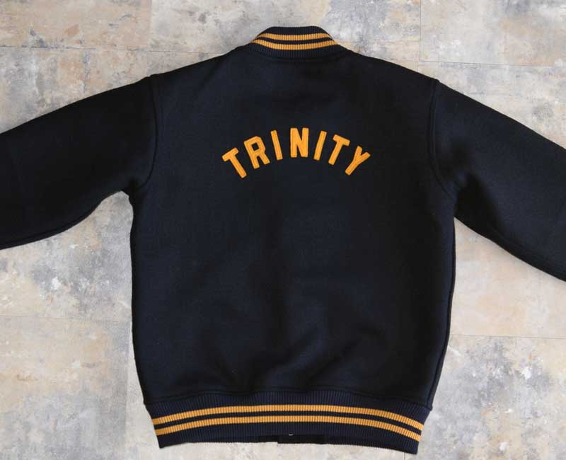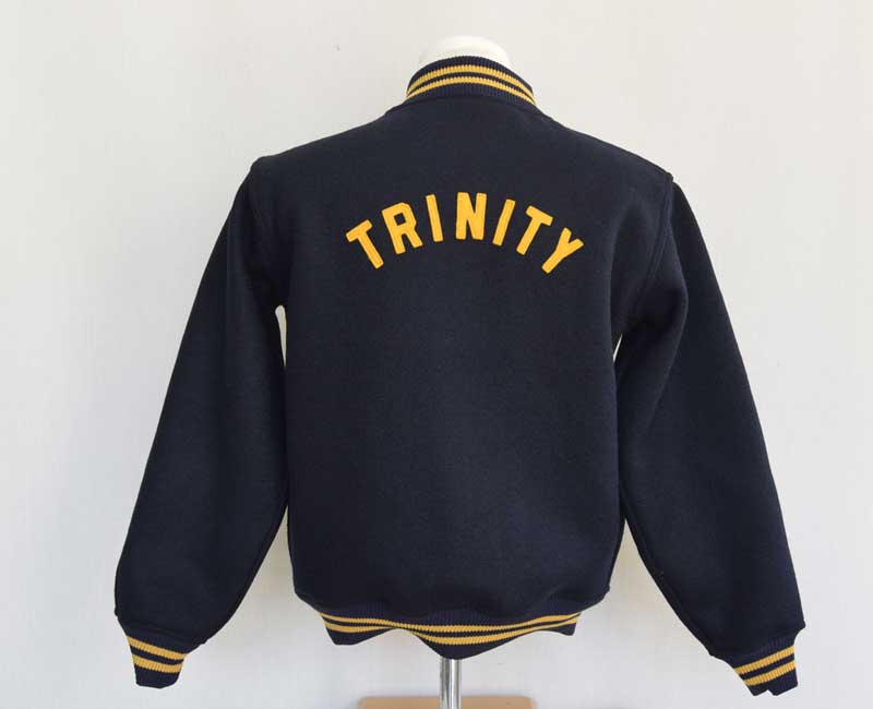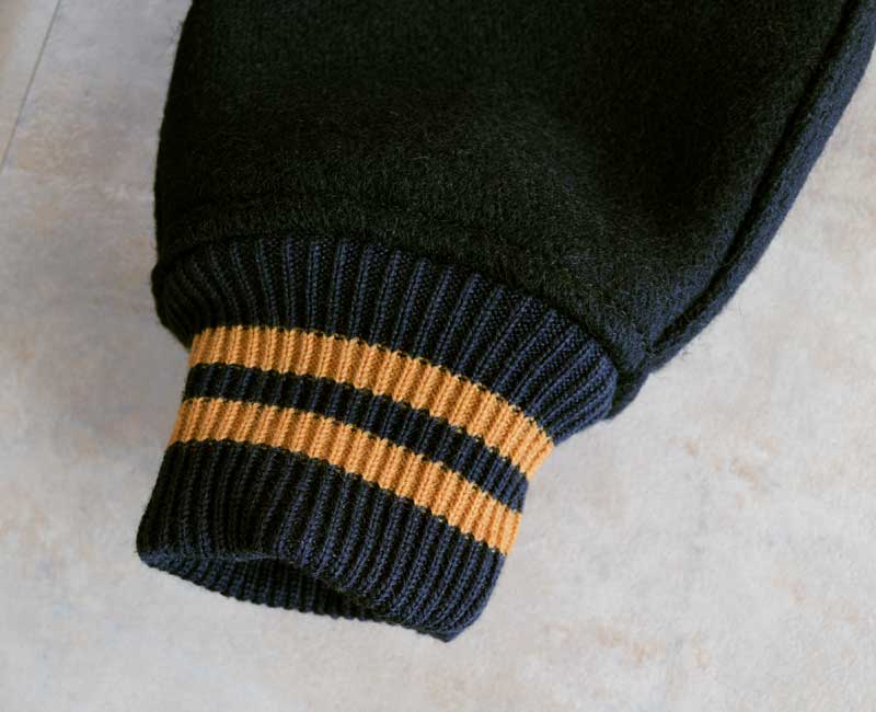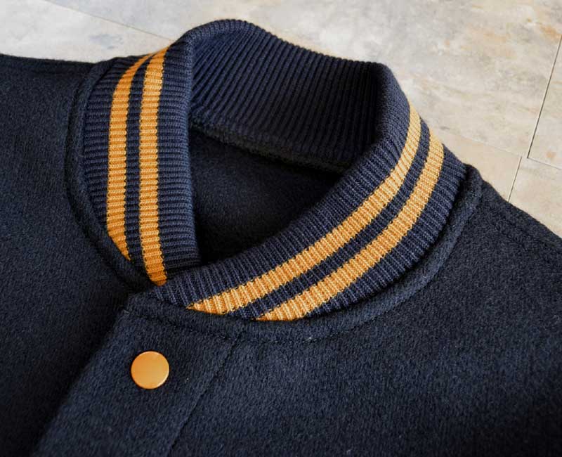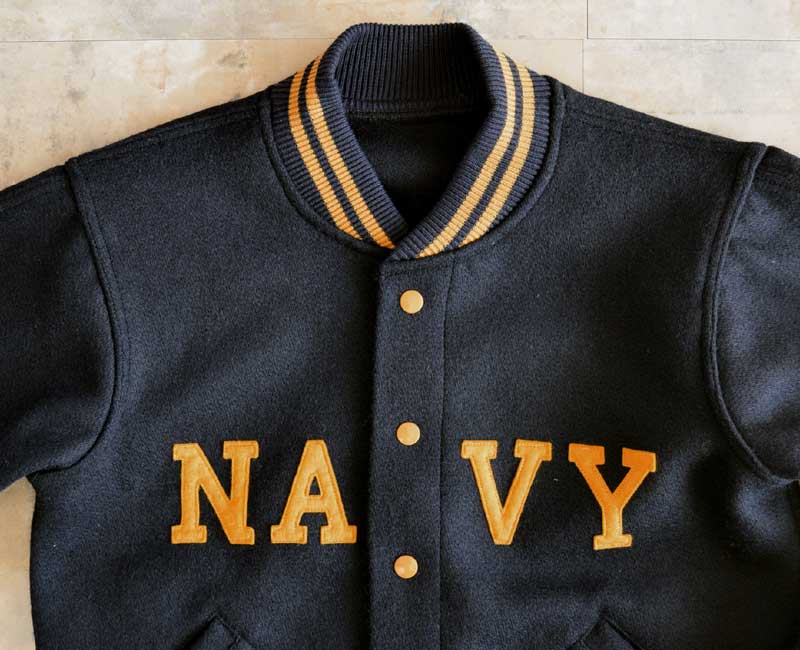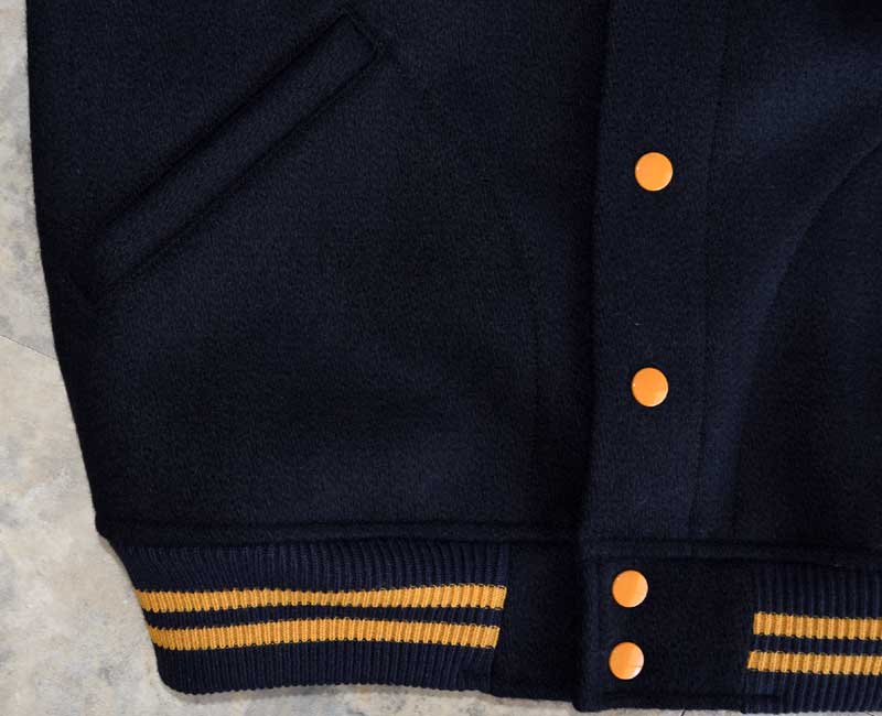 オールメルトンのスナップボタン仕様、ネイビーとフェルトレタリングされたヴァ―シティジャケットです。
