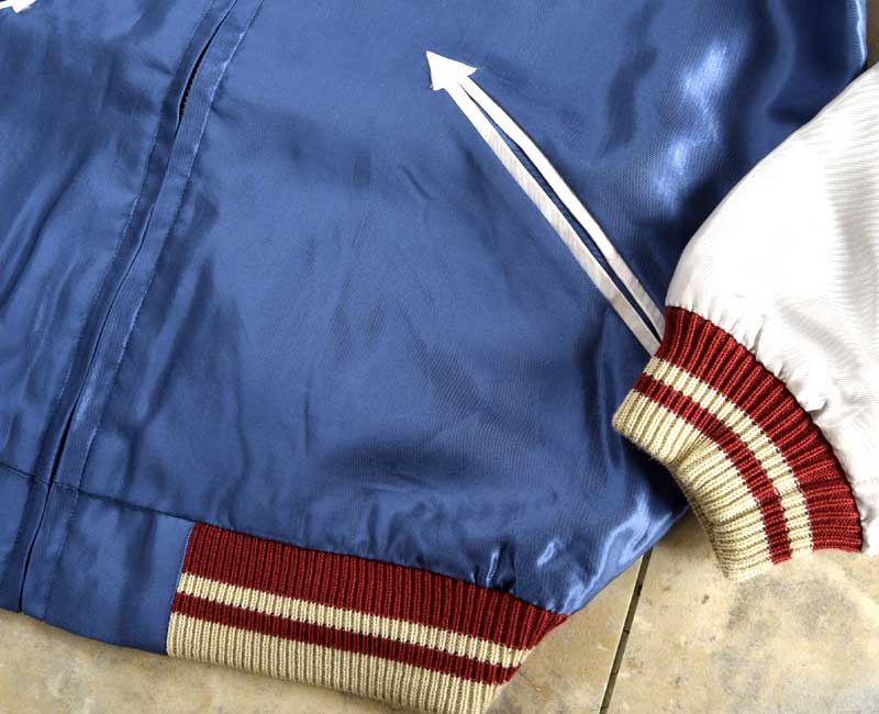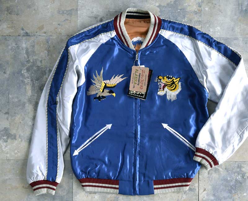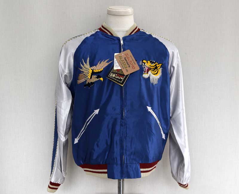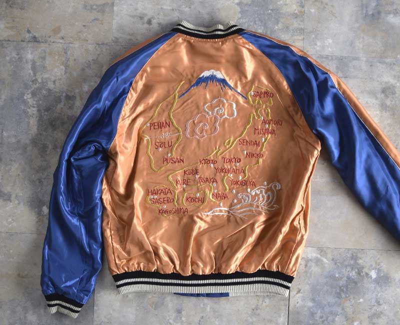 スーベニアジャケットのなかで最もスタンダードな両面にアセテート生地を使ったリバーシブルタイプ。戦後当時のスカジャンには、シルクに似た高級感を持つ物資統制外品目のアセテートが使われていた。中綿がないため季節を問わず着用でき、独特なドレープ感も魅力といえる。
