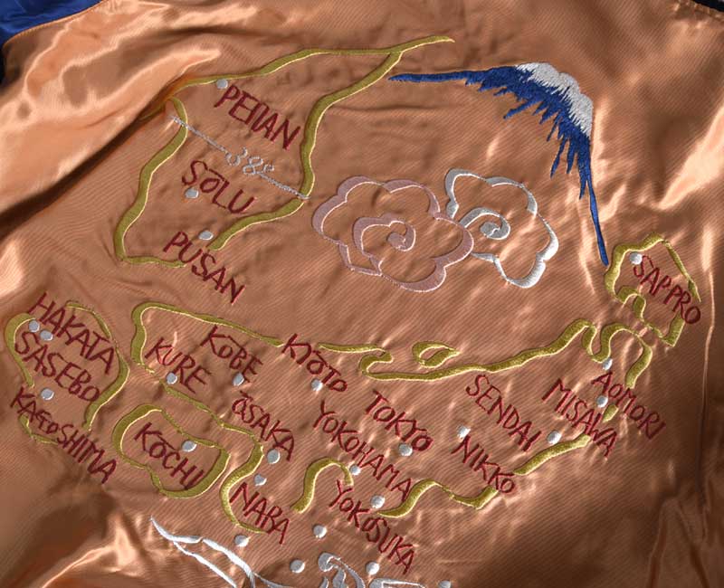 リバーシブル面はジャパンマップ柄。JAPANの文字が無いため日本地図と地名がオレンジのボディに大きく描かれているが、敢えて同系色を使って刺繍糸を馴染ませることで袖と富士山のブルーが際立つように計算されている。また、胸の絵柄は当時同じ刺繍の型で作られていたため両面とも同じ柄だが、よく見ると表裏のボディの色に合わせて異なる色糸で刺繍されており、これもヴィンテージに準じた仕様。