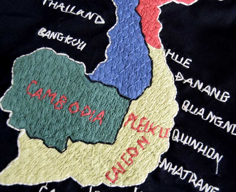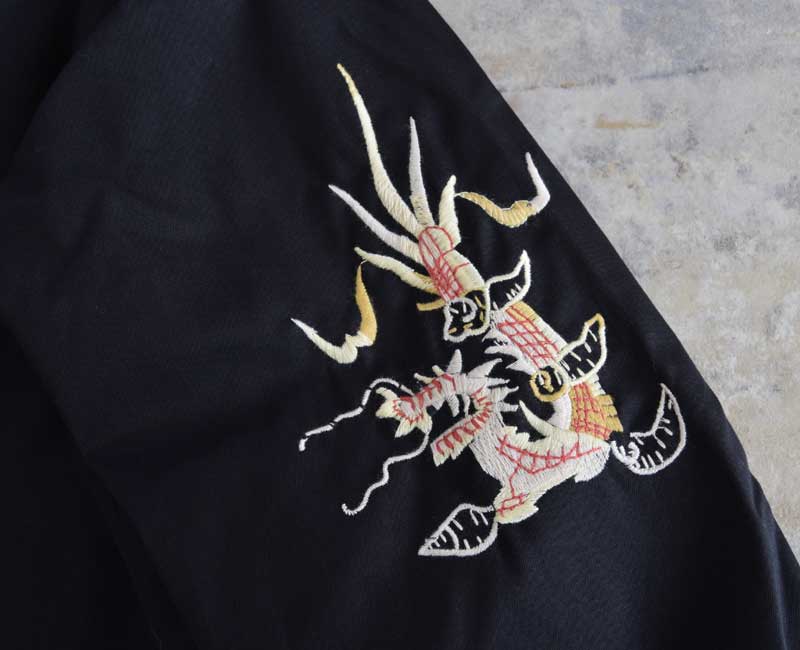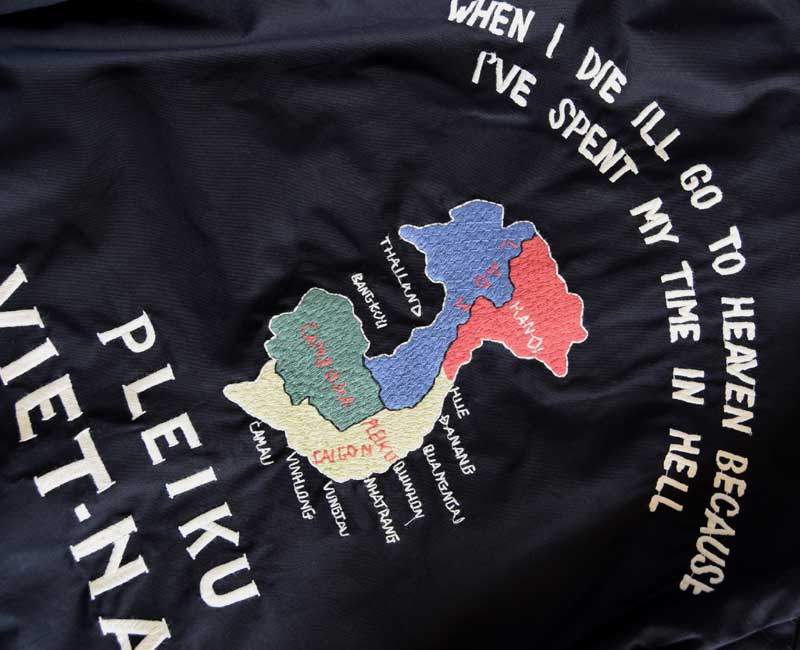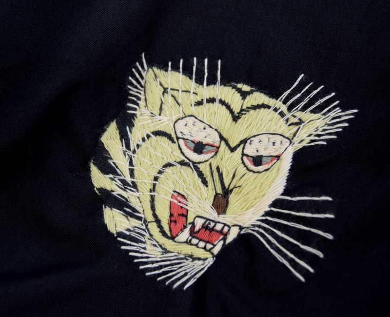 戦後の日本で誕生したスカジャン同様、1960年代から1970年代のベトナム戦争時に生まれたスーベニアジャケットが、通称ベトジャン。コットンツイル、もしくはカモフラージュ柄のポンチョライナーの2種類の生地が主に使われ、マットな太めの色糸で絵柄が刺繍されている。