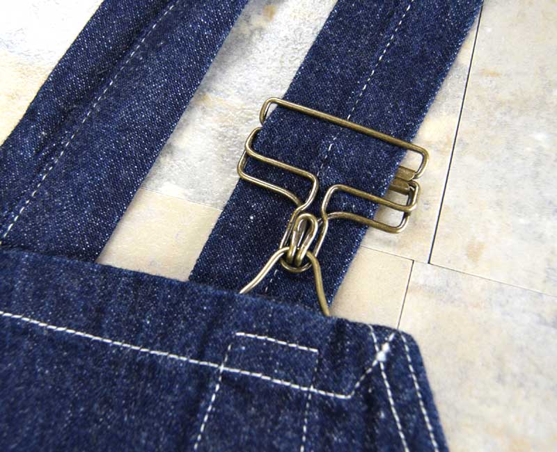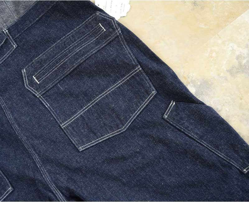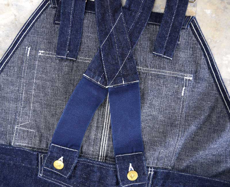 また、オーバーパンツのリアポケットには、ジャケットでは何度か見たことがあるが、パンツやオーバーオールでは見たことのない補強が施されています。こうして出来上がったのがシャドーストライプのインディゴデニムを使ったストロングアーム・レインフォースド・オーバーオールなのです。by John Gluckow