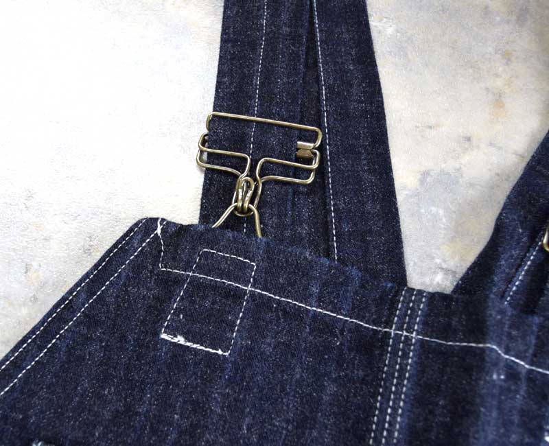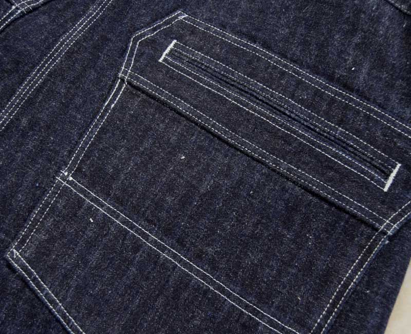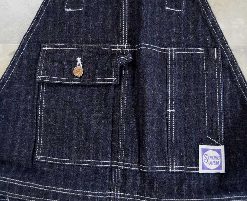 また、オーバーパンツのリアポケットには、ジャケットでは何度か見たことがあるが、パンツやオーバーオールでは見たことのない補強が施されています。こうして出来上がったのがシャドーストライプのインディゴデニムを使ったストロングアーム・レインフォースド・オーバーオールなのです。by John Gluckow
