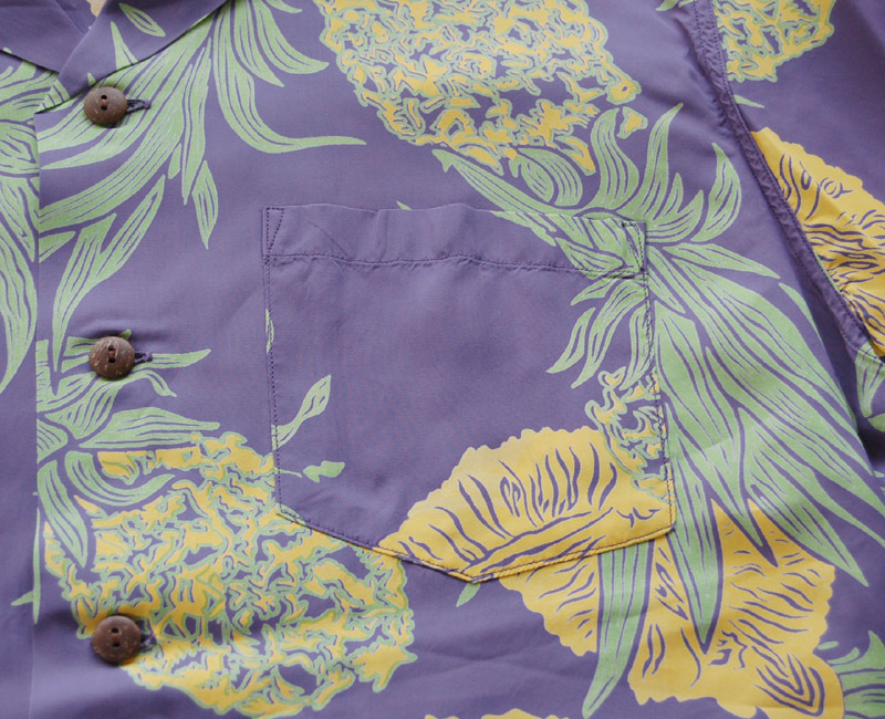 ブランドのロスサーザーランドは1946年に創業したワイキキの高級専門店オーナーの名前が店名になっている。このアイランドパイナップルはデザイナージョンメイグスの別注としてオリジナルラベルをつけて仕上げたもので、通常のアイランドパイナップルとはデザインが多少変更されている。