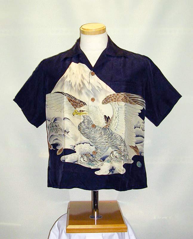 「一富士、二鷹、三茄子」の柄が描かれており、とても縁起が良い商品だと思います。シルク素材でココナツボタンの1950年代の作品になります。柄行はホリゾンタルパターンで左下隅にちょこんと小さく茄子が描かれています。