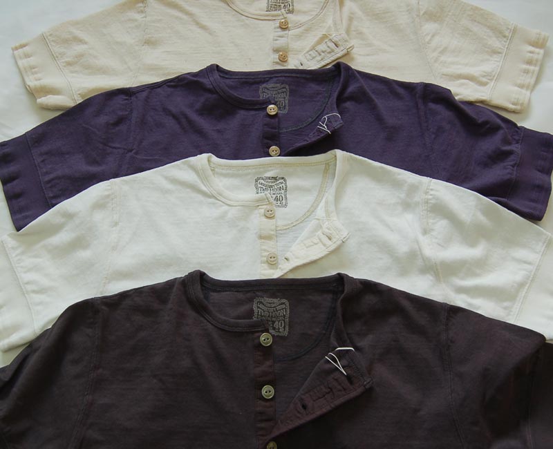 一枚で着用できる丁度良い肉厚になり、コットンの風合いを生かした柔らかい着心地。細い襟リブや前タテ周りの布帛使い、袖に使用した横リブ(良くポロシャツの襟などに使用されている。)などディテールに特徴を持たせ、ちょっと今までとはちがうヘンリーTEEに仕上がっております。