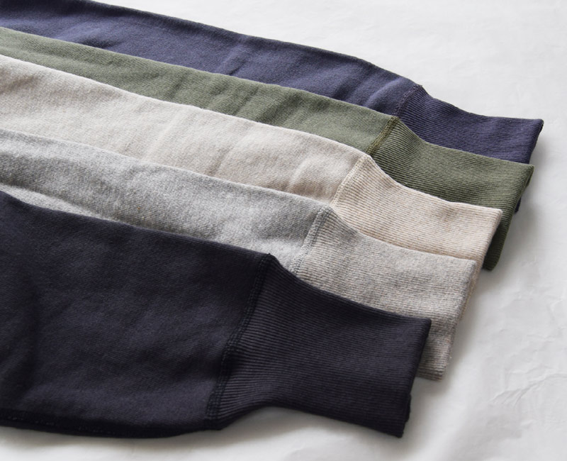 古着の風合いを再現するために最も適した吊編み機を使用しており、染めカラーの表糸には18番の米綿を使用、グレイには繋ぎの40番、裏糸の8番がオーガニックコットンの茶綿のため赤味が強い。経の目が強く出るように番手を設定している。