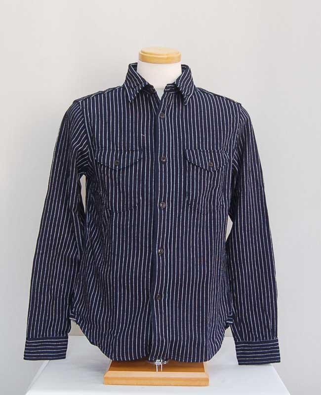 タテ糸とヨコ糸共にロープ染色しており、染まりきらない芯部分が白くのこるため、魅力的な色落ちが楽しめ、よく見なければ判らないですが、タテ糸とヨコ糸でインディゴの色濃度を変えており、微妙にシャンブレー調に見えるように工夫しています。インディゴヘビーネルに生成り色の糸を加え、ストライプ柄。