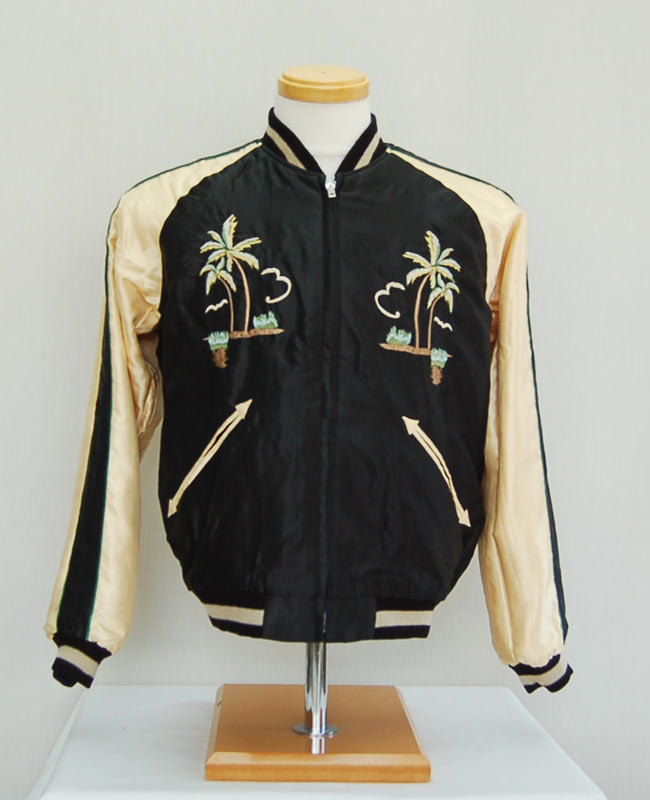 スーベニアジャケット(スカジャン)とは戦後間もない頃、米兵が日本駐留の記念としてオリエンタルな柄(鷲・虎・龍)や所属していた部隊、基地名などを自分たちのジャケットに刺繍したのが始まりである。その後、スカジャンは土産物として商品化され、各地のPX(Post Exchangeの略で米軍基地内の売店の通称)で販売されるようになった。