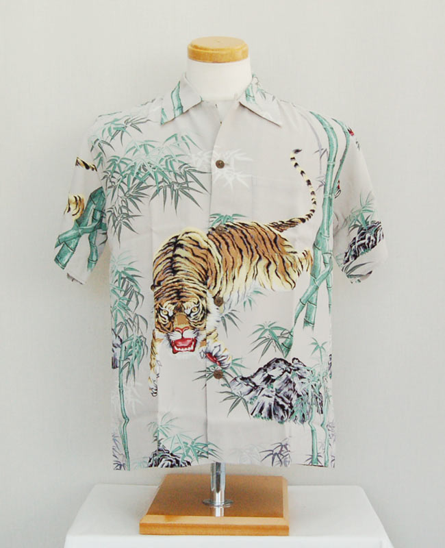 1950年代にホノルルはカパフル・アベニューで創業したアロハシャツメーカー「カイカマヒネ」、ハワイ語で意味は(娘、少女)針に糸巻きのデザイン。今回の柄を含め和柄がほとんどで緻密で完成度が高く前回は2004年スペシャルでは「鶴」の柄を展開しました。今回ご紹介する柄は数有る柄の中で、皆様もご存知の「百虎」とは対照的に1頭の虎がものすごい迫力でシャツ全体に威圧しております。柄使いはホリゾンタルパターンで前身ごろの柄あわせは縫製も難しくまた生地をたくさん使う非常に贅沢な作りになっています。虎好きの方は是非にお勧めさせていただきます。