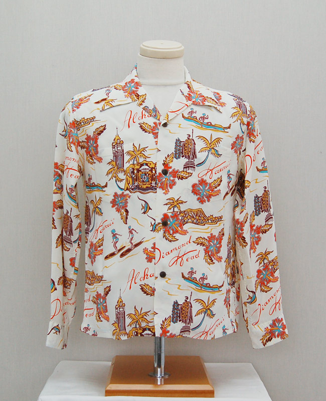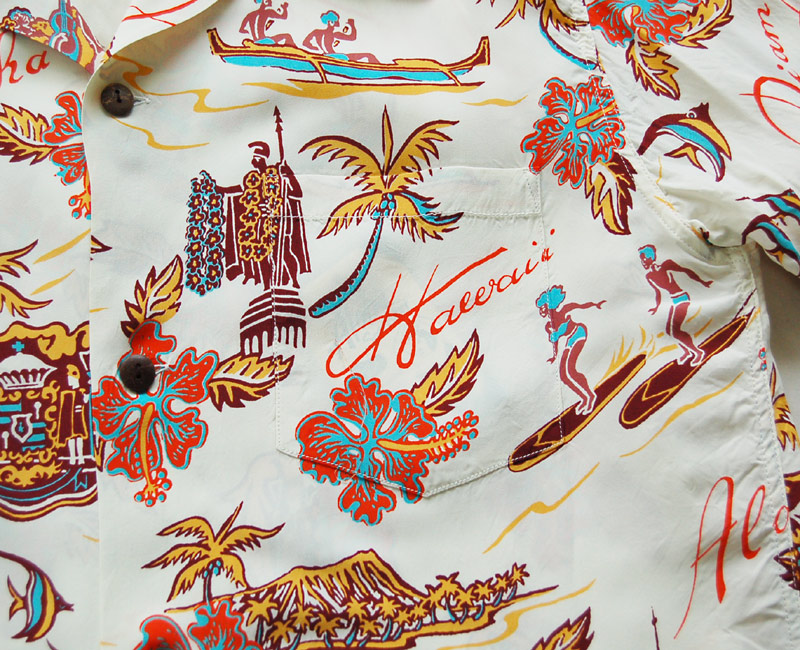 「ポイ・パウンダー・トッグ」はハワイアン・トッグス社が展開していたブランドをクリフォード・ウォンが買い取り、1947年にスタート。この作品にはサーフィンを楽しむ情景や熱帯魚、ハイビスカスにアロハタワーなど、ハワイを代表するモチーフが多く使われている。さらに、ハワイアンクレスト(ハワイ王家の紋章)も描かれ、シャツの希少価値を高めている。