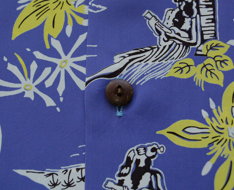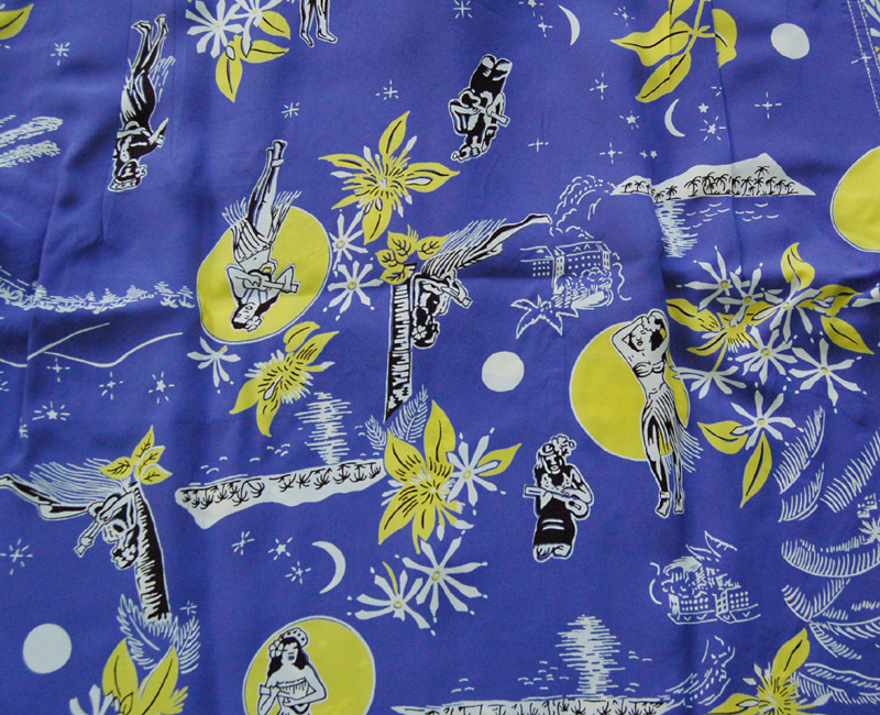 アロハシャツは1950年代に全盛期を迎え、時代を代表するデザイナーが誕生した。その名はジョン・ケオニ・メイグス。彼は1938年にハワイへ移住し、新聞社で記者として執筆活動をする傍らデザインを始めた。’50年代に入り、アメリカ本土のブランドがマーケットへ参入して斬新なアイデアが投入されるようになると、彼はタヒチなどの島々を訪ね、南太平洋の文化を研究して得た知識をもとにオリジナリティ溢れるデザインを発表。月明かりの下、サーフライダース・ホテルをバックに舞うフラダンサーを独自のタッチで描いたこの作品も、メイグスらしい完成度の高い一枚。オリジナルを手がけたのはハワイアン・トッグス社のブランド、ポイパウンダー・トッグ。地元では絶大な人気を誇り、リバティー・ハウスやシアーズといった有名デパートにも卸をしていた。