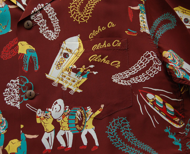 アロハシャツ黎明期からキングスミス・クロージアズというショップを経営し、アロハシャツの歴史を語る上で欠かせない人物、エラリー・チャン。彼はアロハシャツの生みの親と言われており、その妹エセル・チャンもまた同社のデザイナーとして数々の傑作を世に残した。この作品は、港に到着したツーリストを歓迎する様子を、エセルらしい独特のタッチで描いた一枚。