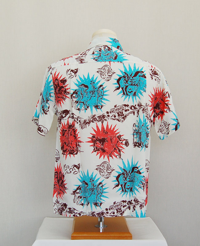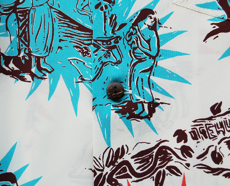 ジョン・メイグスの代表作「ゴーギャン・ウッドカット」。その名の通り画家ポール・ゴーギャンが描いた木版画をモチーフとしており、ヴィンテージアロハシャツコレクターからも芸術性を高く評価されている名作である。