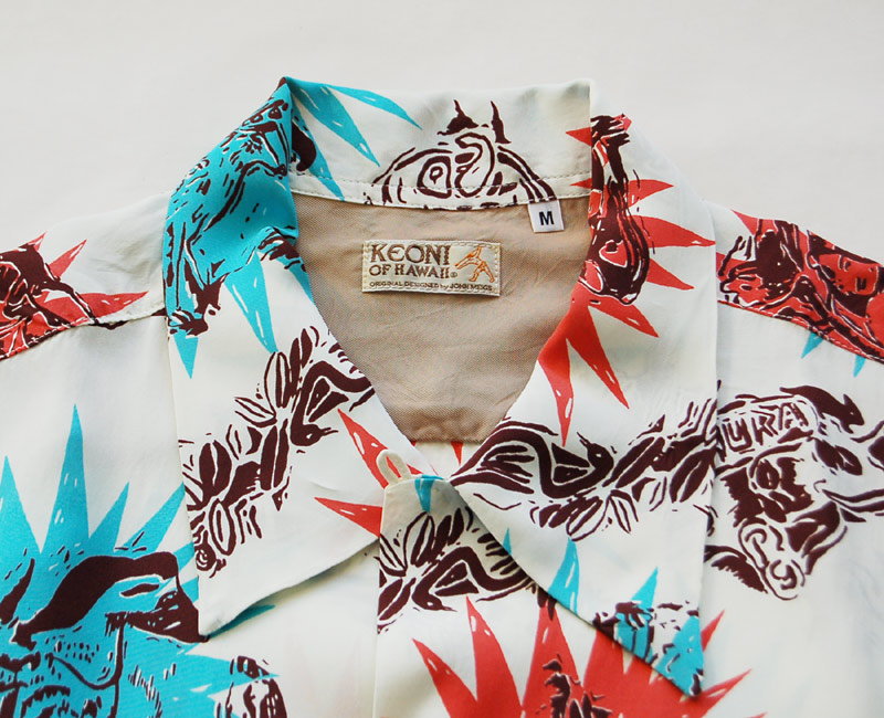 メイグスにとってゴーギャンは憧れの存在であり、’40年代にゴーギャンの木版画連作「ノアノア」を再構築したアロハシャツ「ゴーギャン・ウッドカット・ファースト」を発表。当時、2作目までは製品化されたが、第3作目は彩色済みのデザイン画の段階までで世に放たれることはなかった。ところが、それから50年近くを経た1996年、メイグス本人からサンサーフへ、幻の第3作目を製品化したいという話が持ち込まれる。これがきっかけとなり、アロハシャツの歴史に新たなページを刻むプロジェクト「ケオニ・オブ・ハワイ」がスタートした。