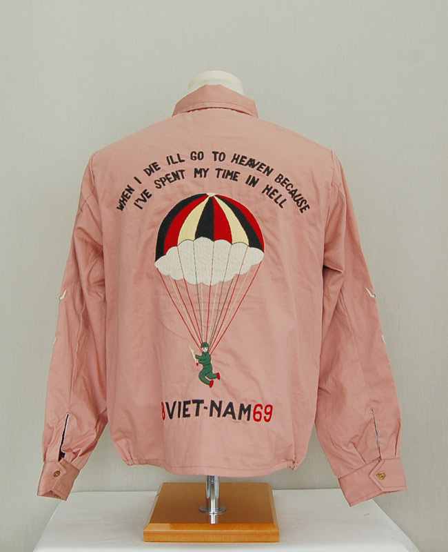 ■1968~1969年の間、ベトナムに駐留していた米兵が母国に持ち帰ったベトジャンを再現。こちらは定番のスタイルから外れ、袖だけでなく左胸にも龍、背中にパラシュートの刺繍が入った珍しい一着。パラシュート部隊に所属していた兵士のカスタムオーダー品と考えられる。本来はブラックモデルで製作されておりますが、ヴィンテージでも珍しいピンクが登場。