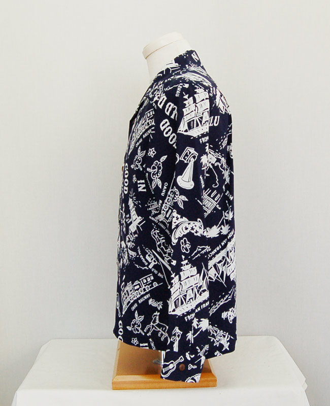 1940年代後期に作られたオアフ・ガーメント社の作品。「古き良き時代」というタイトルが付けられた本作に描かれているのは、南国の楽園として華やかな発展を遂げる前のハワイ