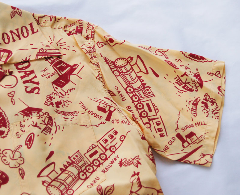 1940年代後期に作られたオアフ・ガーメント社の作品。「古き良き時代」というタイトルが付けられた本作に描かれているのは、南国の楽園として華やかな発展を遂げる前のハワイ。馬車やオアフ鉄道などが描かれていることから1890年代後半のハワイの情景であることが推測できる。当時を象徴するモチーフを使い、単色の抜染(ばっせん)で表現したノスタルジックな雰囲気に心奪われる一枚。