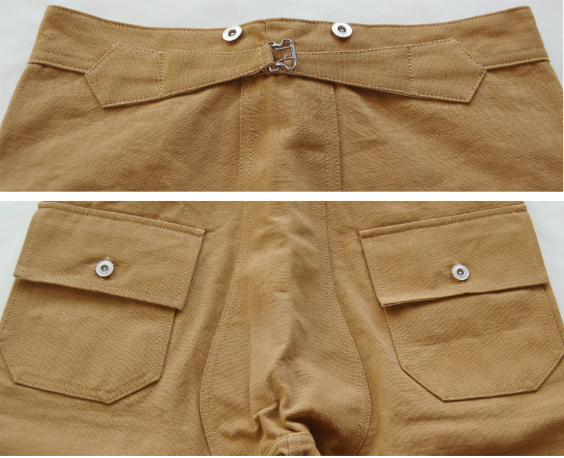 4つのフラップポケットは収納が落ちないようにされた設計で、乗馬が基本だった時代の特徴である尻繰りの中心に当て布が縫われています。