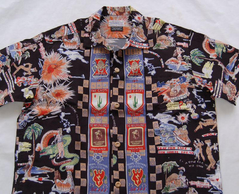多くのリクエストに応え再復刻となったこの作品は、1941年 10月にハワイ師団より編成されたアメリカ陸軍第25歩兵師団「トロピック・ライトニング」を題材としている。1950年に勃発した朝鮮戦争に投入され、主力部隊として活躍した同師団が、1953年に派遣先の韓国からハワイへと帰還した際に凱旋記念として製作されたメモリアルな一枚。デザインの中には彼らが所属していたオアフ島スコフィールド駐屯地での訓練シーンや、戦場での様子がユーモラスに描かれている。マッカーサー元帥の階級章と共に、1951年の退任演説の際の OLD SOLDIERS NEVER DIE(老兵は死なず)という言葉が刻まれているのも特徴。