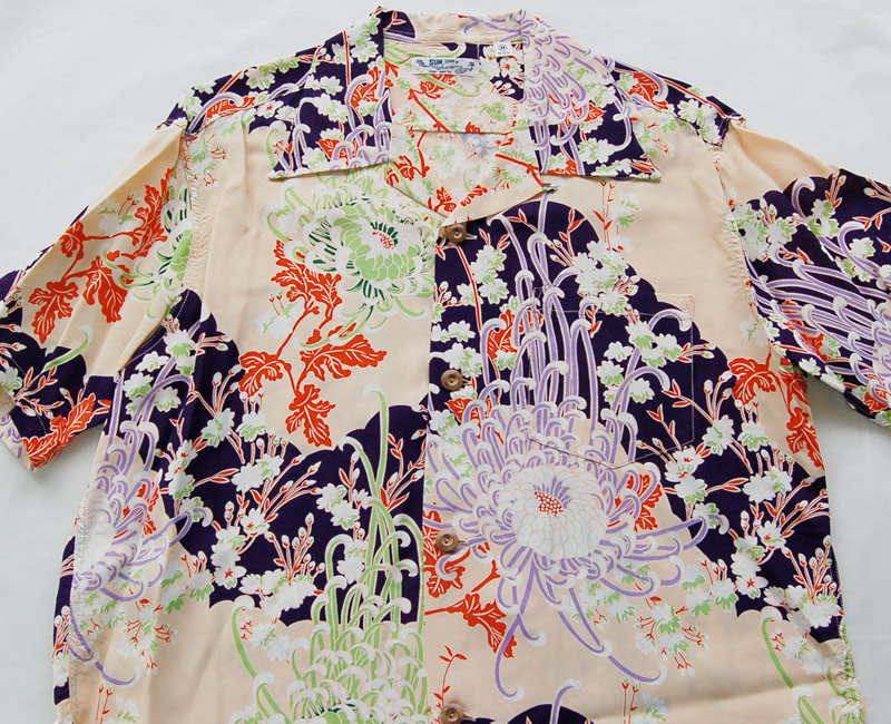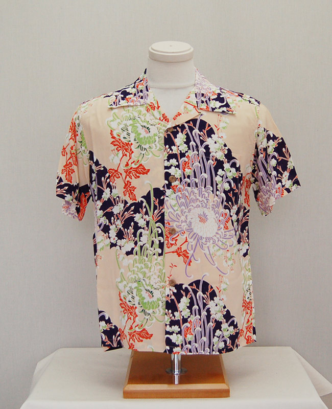 当時からオリエンタル・デザインのアロハシャツには縮緬素材が使われることが多いが、この作品はフィラメント・レーヨンに菊の花を大胆に描いた珍しい一枚。抜染と呼ばれる特殊な捺染の技法を用いて、モチーフとなる菊を染め抜くだけでなく立体感をも見事に表現している。これらの生地がハワイで流通することにより当時の日本の捺染技術は高く評価され、多くの生地の発注へと繋がっていった。