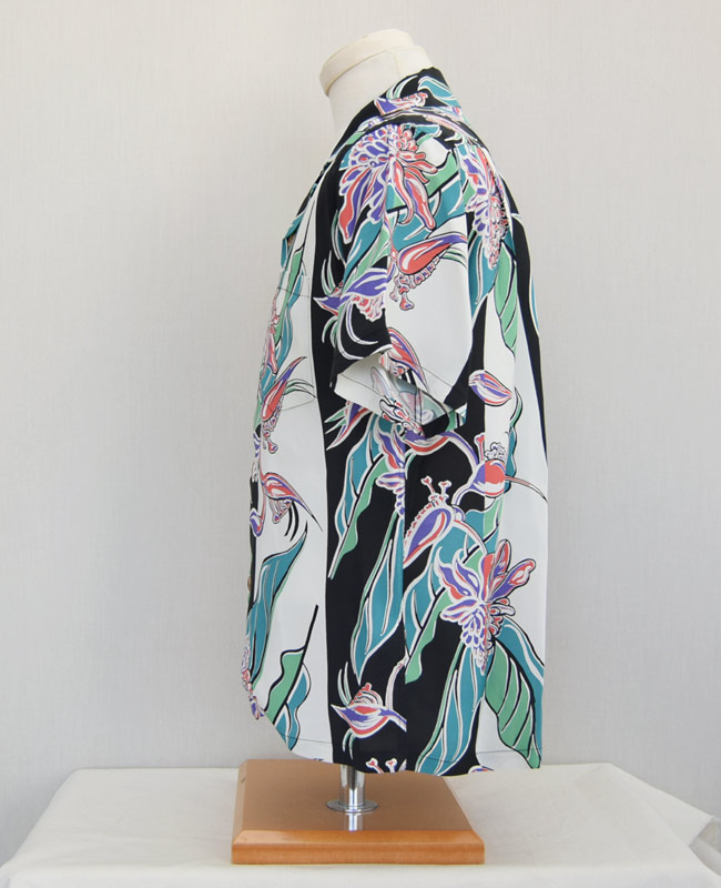 モチーフとなっているのはショウガ科の多年草であるトーチジンジャー。ハワイでの歴史は古く、自生しやすい気候であることから島のいたるところで咲き、人々を楽しませている。アロハシャツのデザインとしても初期の頃から見られ、長きにわたり人気のモチーフとして採用され続けてきたハワイを代表する植物のひとつと言えよう。今回復刻したこの作品はボーダー状に区切られたグランドにトーチジンジャーを置き、さらに色で切り替えた斬新なデザイン。カメハメハ・ガーメント社の柄に対しての強いこだわりが伝わる一枚となっている。
