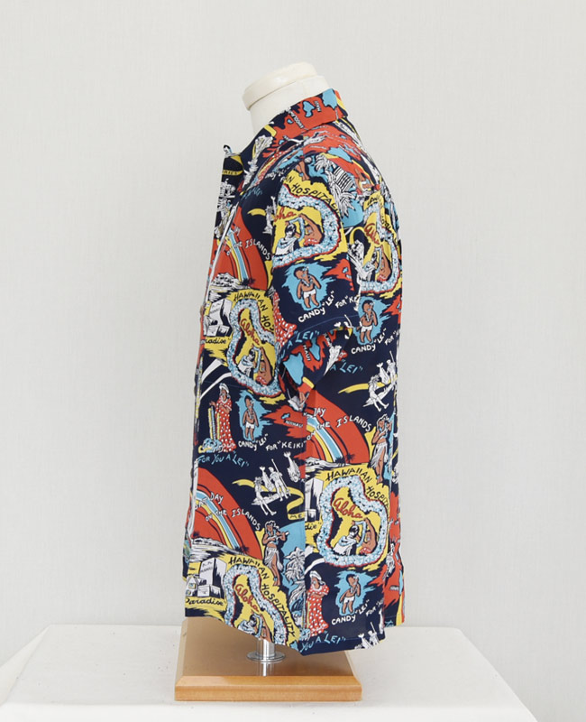 サンサーフに数多く寄せられるアロハシャツ復刻のリクエスト。そのリクエストが絶えない作品のひとつが、この「ハワイアン・ホスピタリティ」と名付けられたデザインで、ヴィンテージアロハシャツを扱う書籍に度々掲載され、コレクターからの人気も高い。長い船旅の後、ハワイに降り立った観光客を盛大に歓迎するハワイのおもてなし(ホスピタリティ)の様子が華やかに描かれ、アロハタワー、マトソン・ラインの豪華客船ルアライン、ロイヤル・ハワイアン・ホテルなど人気のモチーフが数多く登場。その中でも特筆すべきはカメハメハ大王像と自由の女神が並んで描かれている点で、さらに作品の価値を高め、とても贅沢なデザインに仕上がっている。