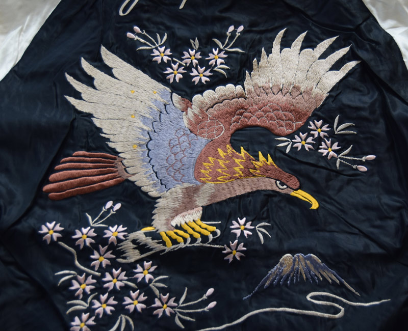 リバーシブル面は咲き誇る桜の中で翼を広げる鷲の図案。ヴィンテージスカジャンにおいて桜は鷲とともに描かれることが多いが、本作は桜を細かく、数多く描写しているのが特徴。ブラックのアセテートに淡い色の桜が際立ち、当時の米兵の心をくすぐる日本の美学が表現されている。