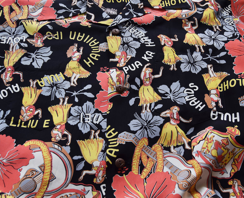 マリヒニ・スポーツウェア社のブランド、マリヒニが 1950年代後期に手掛けた作品。同社を立ち上げたのは日本生まれのレイモンド・ササキという人物で、絵を学んだ経験のあるレイモンドは柄に対してのこだわりが強く、マリヒニ・ブランドのデザインは完成度の高いものが多い。フラガールをはじめ、大胆に描かれたハワイアン・クレストやウクレレ、ハイビスカスが非常に印象的な楽園ハワイを象徴する華やかな一枚