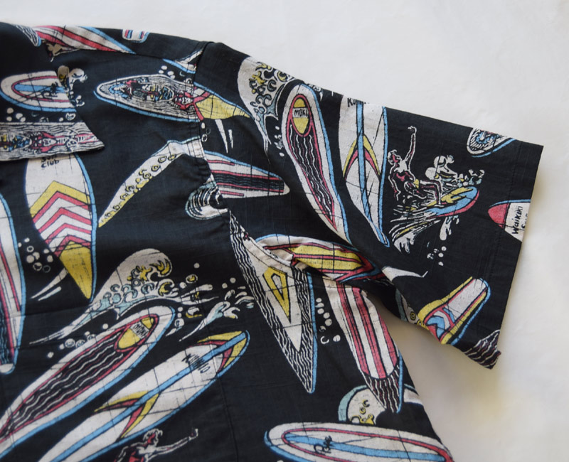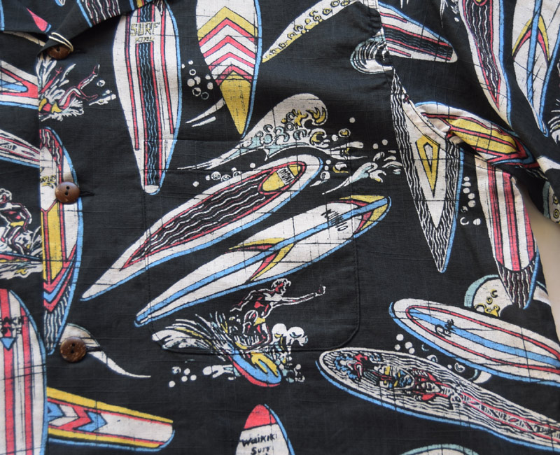 1947年に創業したジョージ・A・シャヒーン社は、ハワイのアロハシャツ・メーカーの中でも唯一、自前のプリント工場や専属のテキスタイル・デザイナーを持つ大手メーカー。このサーフボードのデザインは同社がプリント工場を持つ前の作品で、ブランドを代表する柄となった人気のデザイン。