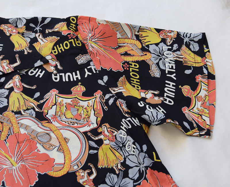 マリヒニ・スポーツウェア社のブランド、マリヒニが 1950年代後期に手掛けた作品。同社を立ち上げたのは日本生まれのレイモンド・ササキという人物で、絵を学んだ経験のあるレイモンドは柄に対してのこだわりが強く、マリヒニ・ブランドのデザインは完成度の高いものが多い。フラガールをはじめ、大胆に描かれたハワイアン・クレストやウクレレ、ハイビスカスが非常に印象的な楽園ハワイを象徴する華やかな一枚。