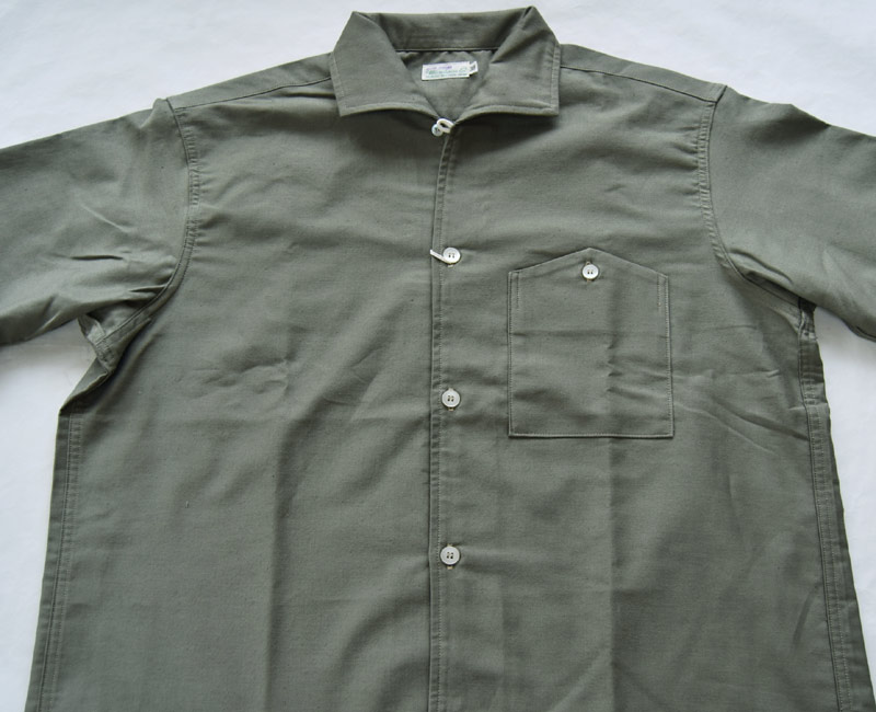 山型のポケットはワークシャツで有名な「ビッグヤンク」ではなく、デザインのアクセントとして採用されたもので、イタリアンカラーと袖の折り返しのボタン仕様など、1950年代から流行した半袖のカジュアルシャツをアップデイトさせているものです。ワークエアの無骨なディテールをアクセントにした、ヴィンテージシャツでありながら、古臭さを感じさせない新鮮な印象です。