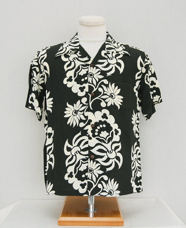 1949年にデザイナーのベティ・ロバートソンが立ち上げたブランド、ナニ・オブ・ハワイの作品。同ブランドは創業当初、水着とスポーツウェアを専門としていたが、1950年代に入るとすぐにアロハシャツのマーケットに参入した。抽象的に描かれた花々で構成されるボーダー・パターンは、タヒチの民族衣装であったパレウをイメージして組まれており、ベティの才能と造詣の深さが垣間見える完成度の高いデザインとなっている。