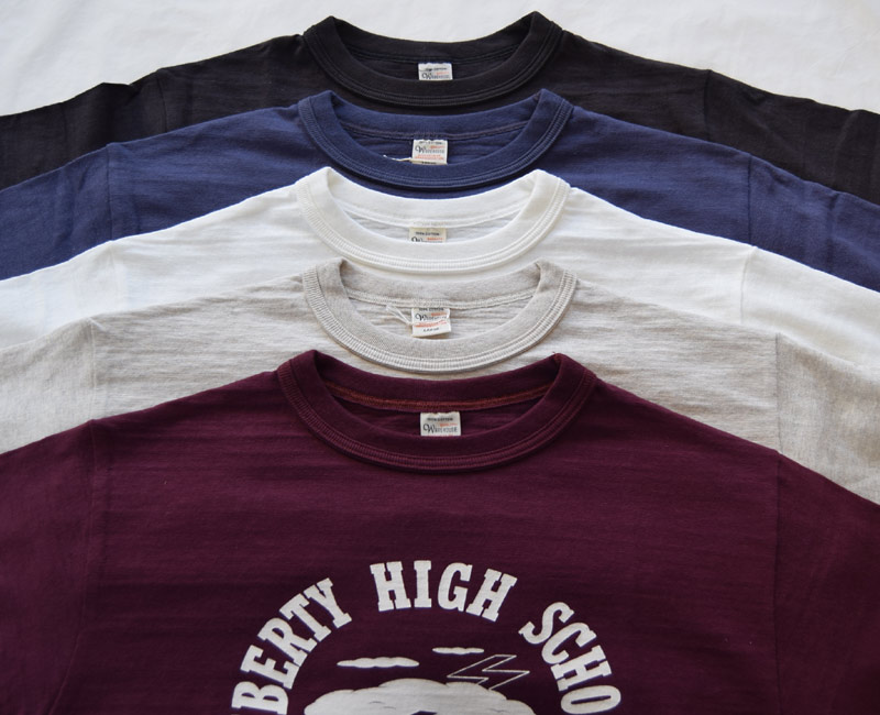 「吊り編み機より希少」といわれる旧式のローゲージ編み機で編まれたウエアハウスの定番ボディです。12番のムラ糸で独特の陰影が出るように編まれたこの生地はシャドウボーダーと呼ばれており、無地でありながらうっすらと横段のようなムラが浮かびます。極端に前下がりの現代的なネックラインではなく、フライスにパイピングを噛ませる事で強度を保ちながら、着込むほどにネックラインが緩み自然な前下がりが生じます。