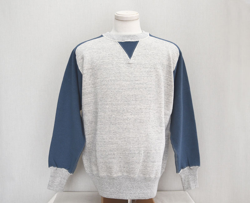 1930年代から40年代のものの中から、このツートンカラーのフリーダムスリーブのスウェットを見つけたのです。色とその色落ちがとても良かったから、どうしても作りたかったんです。グレーに映えるグリーンとブルーの組み合わせがたまらない。いつものように、ウェアハウスは色と色落ちのちょうどいいミックスを見つけてくれました。