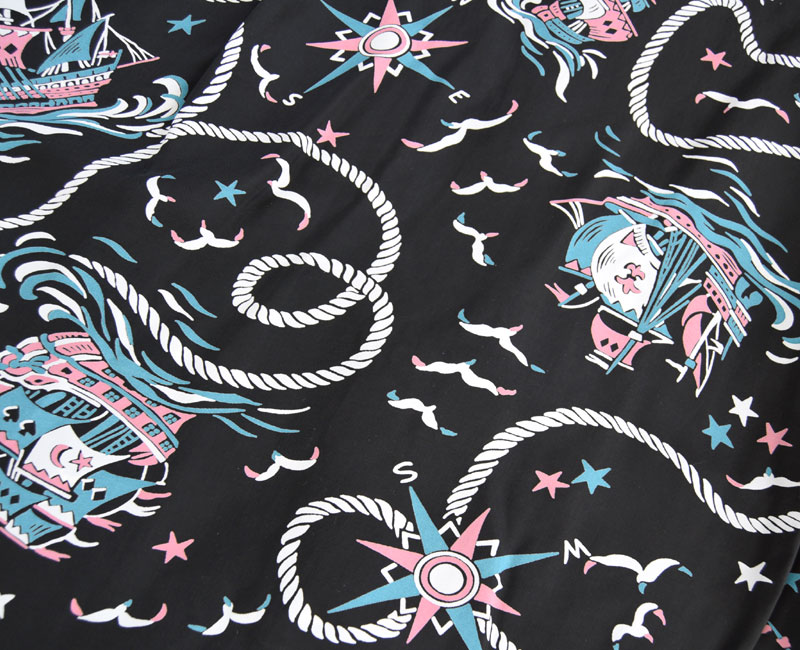 大型の帆掛け船による大海への航海がシャツ一面を使い表現された作品。ロープに羅針盤、夜空に輝く星、船の周りを飛び交うカモメが絶妙なバランスで配置されている。手がけたのはアメリカ本土で数多くのアロハシャツを生み出したブランド「メイド・イン・カリフォルニア」。同ブランドはアメリカ本土でのアロハシャツの爆発的な流行が起こるきっかけを作ったと言っても過言ではなく、人々を引きつける魅力的な作品を次々と世に送り出した。