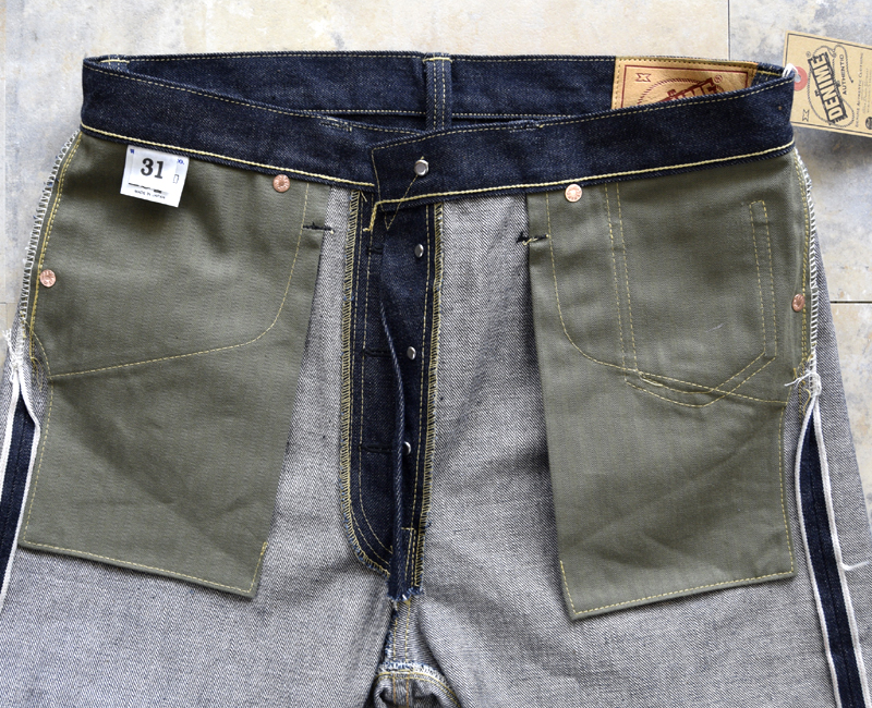 少し肉厚のデニム素材で仕上げており、ポケットスレキはオリジナルODグリーンのへリンボンスレキを使用。